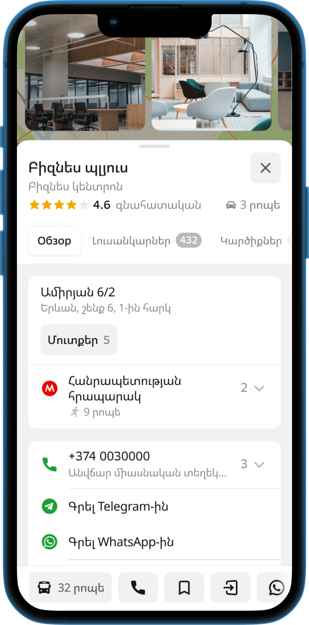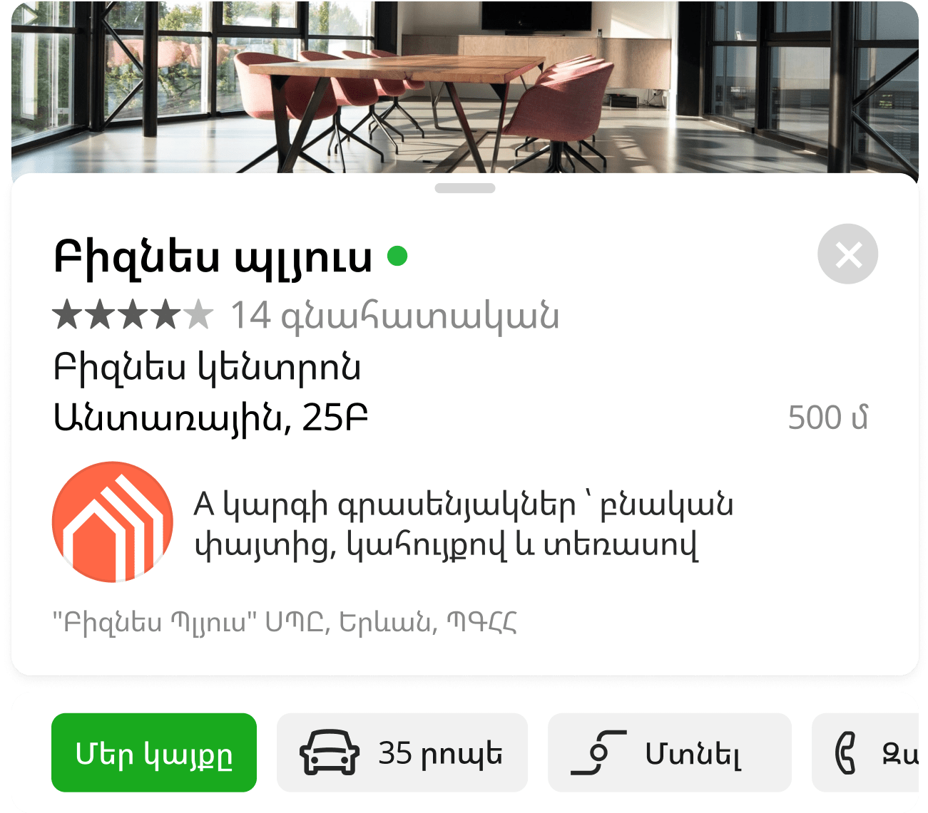 Օգտատերերը տեսնում են ձեր լոգոտիպը նավիգատորում, երբ գտնվում են ձեր կողքին։ Իսկ սեղմելով լոգոտիպին՝ նրանք կստանան ավելի շատ տեղեկություն կամ կկառուցեն երթուղի, որպեսզի անմիջապես այցելեն ձեզ։