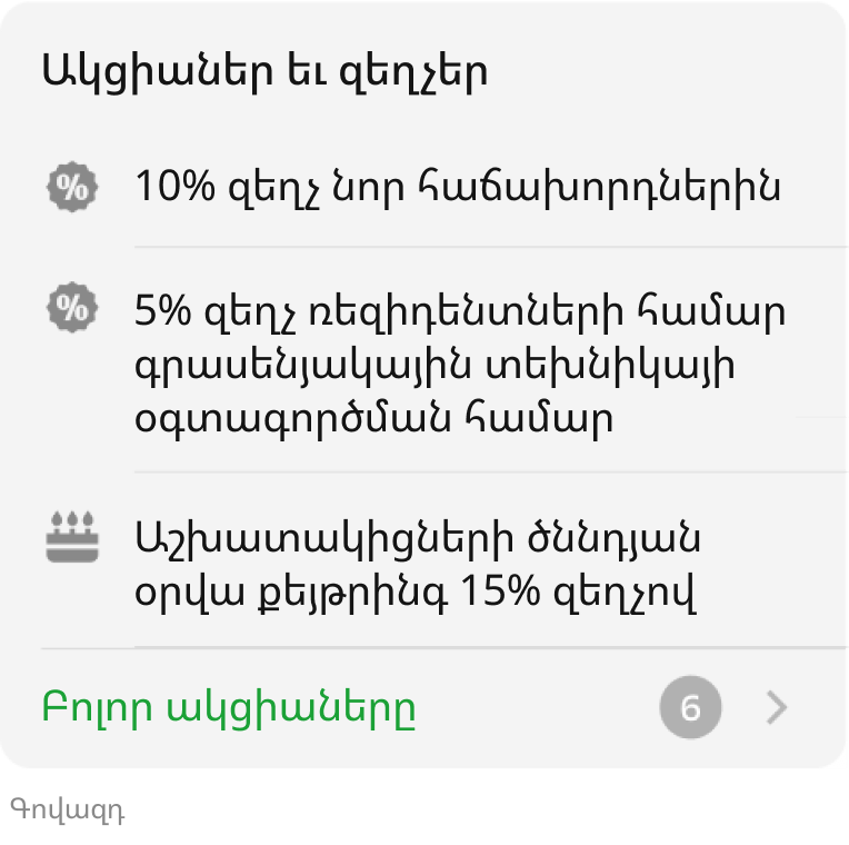 Զեղչերի բլոկ Բոլորը սիրում են շահավետ առաջարկներ՝ պատմեք ձեր ակցիաների մասին 2GIS-ի օգտատերերին։
