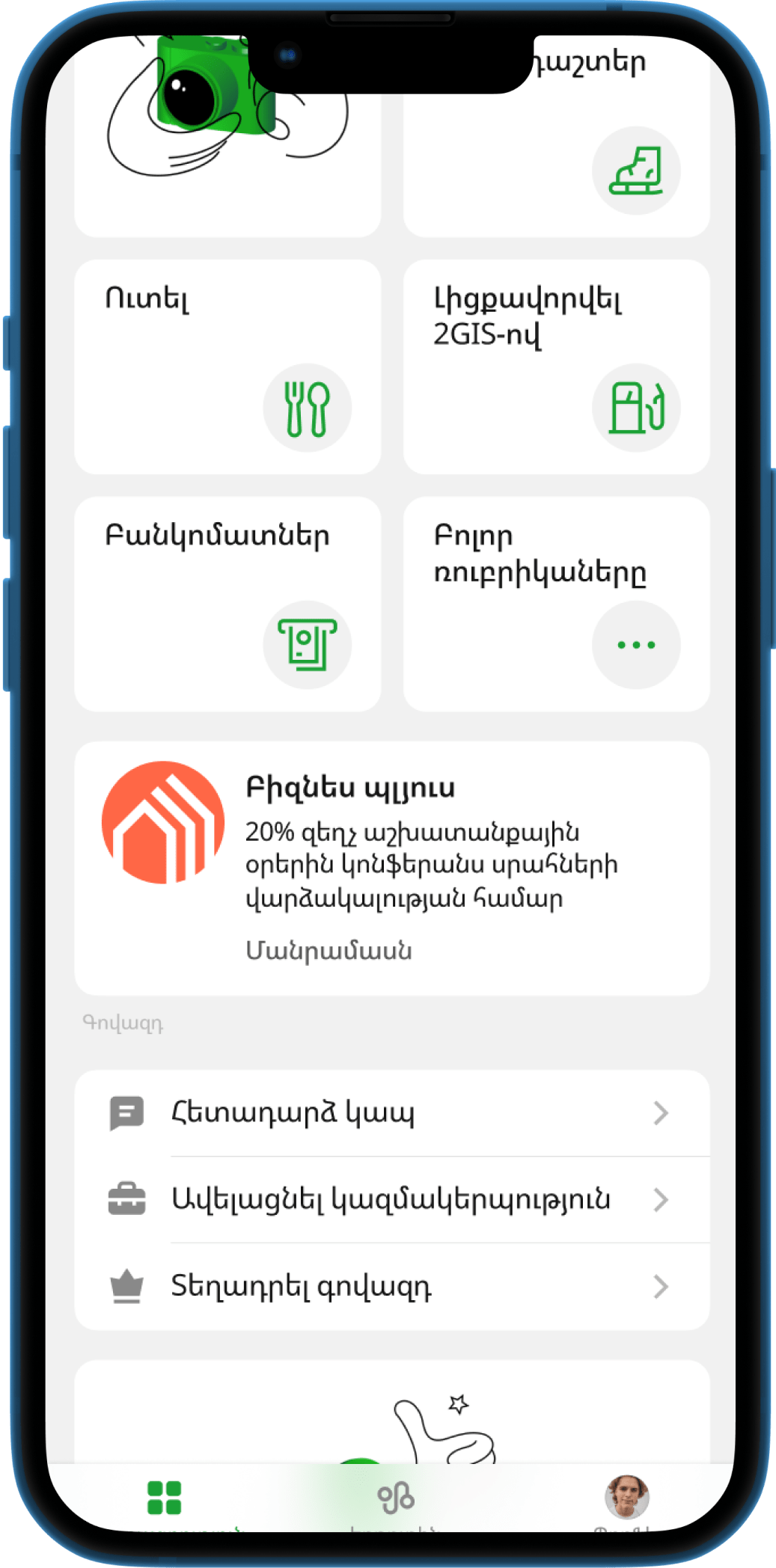 Բաններ շարժական տարբերակի դաշբորդում Դաշբորդը և ձեր բանները դրա վրա առաջինն են, որ տեսնում են օգտատերերը 2GIS-ի շարժական հավելվածում։ Բանները գրավում է առավելագույն լայն լսարան։